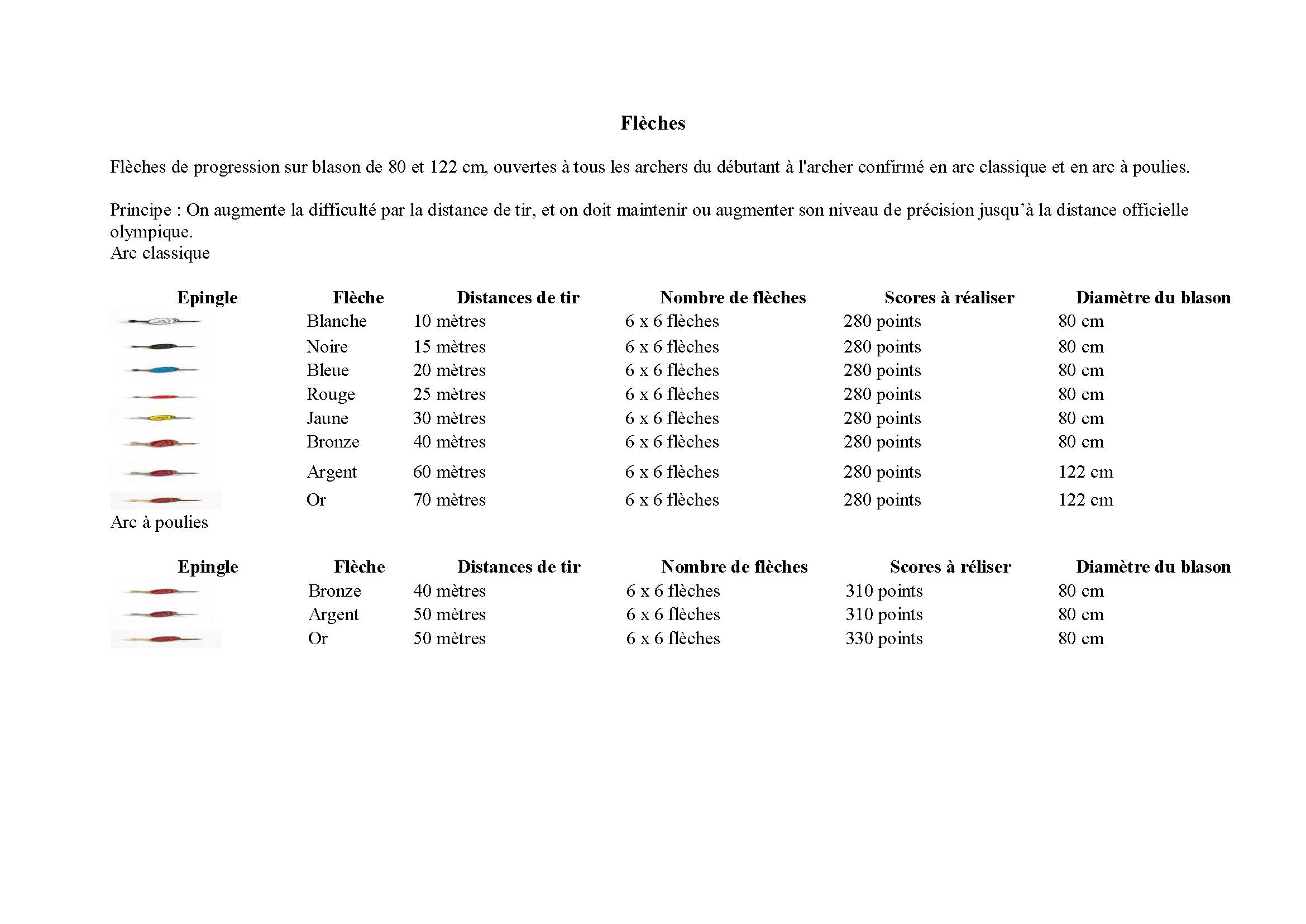 Comme les "plumes" pour les archers débutants, les "flèches" permettent de valider la progression des archers confirmés. Ce document liste les différentes "flèches".