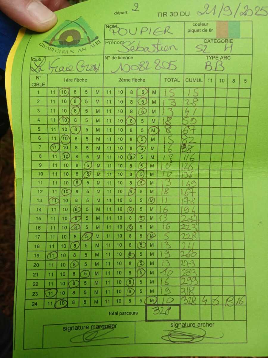 Le parcours, entièrement revisité et parfaitement protégé, a offert de superbes situations de tir. Sébastien en a profité pour placer de belles flèches et décrocher une excellente 3ᵉ place, juste derrière les copains de Pontivy et de Redon.